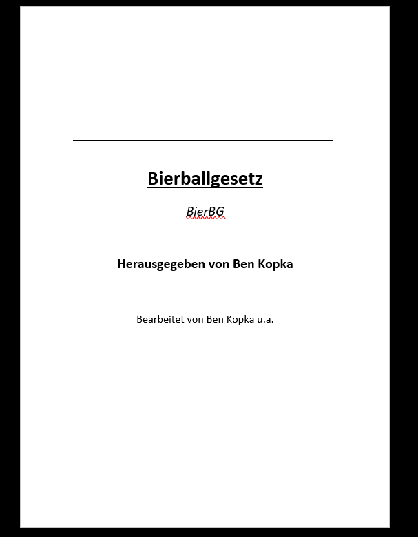 „Recht und Gesetz setzen eine allgemeine Ordnung zum zivilisierten Zusammenleben auf unserer Welt. Jeder Mensch obliegt ihnen. Im folgenden Buch findet sich die erste wahrhaftig legitime Kodifizierung eines Grundbestandteils gesellschaftlichen Zusammenleben in welchem bisher nur lokal, primitive Gewohnheiten diktierten. Das Bierballgesetz räumt auf mit barbarischer Willkür in einem bisher rechtsfreien Raum und erzeugt Rechtssicherheit im heiligen Spiel des Volkes.“